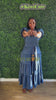 This denim maxi dress blends effortless style with bold individuality, perfect for making a statement. The voluminous puff sleeves and tiered skirt create a striking silhouette, while the cinched waist offers a flattering, tailored fit. Its deep indigo hue contrasts beautifully against the lush greenery, evoking a fresh, natural vibe. Paired with sleek aviator sunglasses, the look is both timeless and trendsetting, exuding confidence and cool.