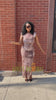 This modern dress showcases a sleek, fitted silhouette that emphasizes a confident and sophisticated look. Featuring a high neckline and cap sleeves, the dress offers a blend of contemporary style and timeless elegance. The subtle pattern on the fabric adds an intriguing texture, enhancing the dress's visual appeal. The full-length design elongates the figure, making it an ideal choice for formal events or upscale gatherings. Perfectly balancing minimalism and luxury, this dress ensures you stand out with grace and poise.